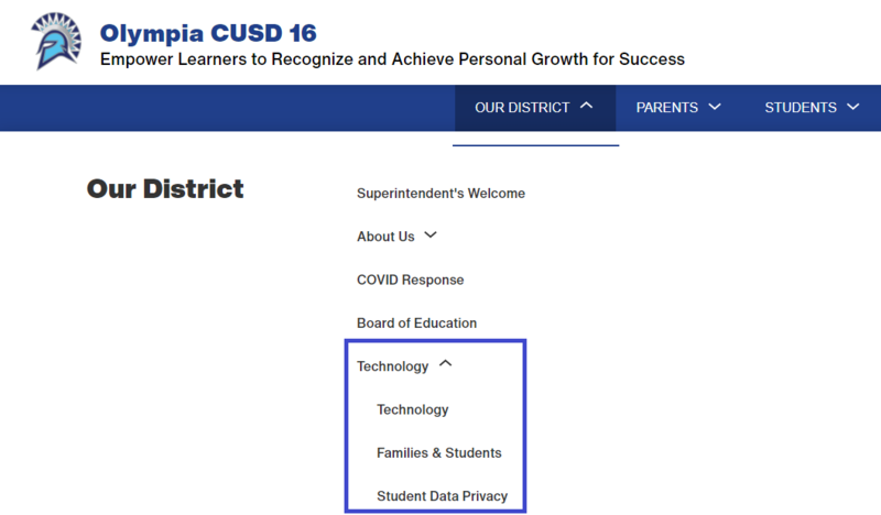 When we launched the new website design in December 2020, we also debuted a suite of new Technology websites. We now have a main Technology page, a Family & Students page, and a Student Data Privacy page. You can find all of these pages on our district site in the Our District menu.